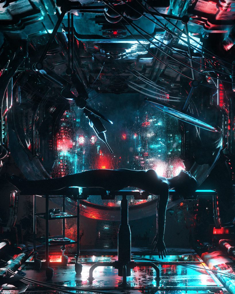 Illustrations in the cyberpunk style depict non-existent worlds and spaces filled with neon lights, mysterious shadows, technology, and people.
