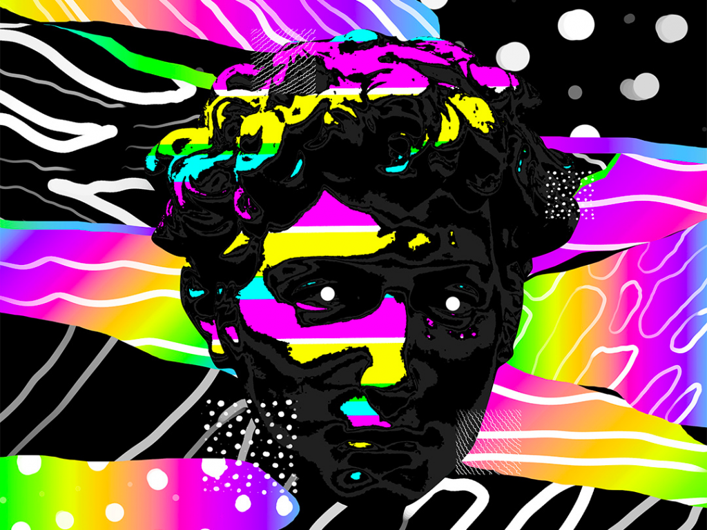 Bright saturated colors, neon, and glitch are the distinctive features of cyberpunk in graphic design. The further away from natural images, the better.